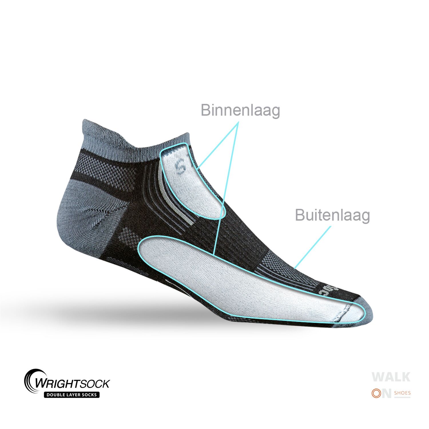 * Met dubbellaagse anti-blaren technologie. Door het gebruik van dubbellaagse sokken wordt de wrijving opgevangen tussen de sokken, in plaats van door de huid.